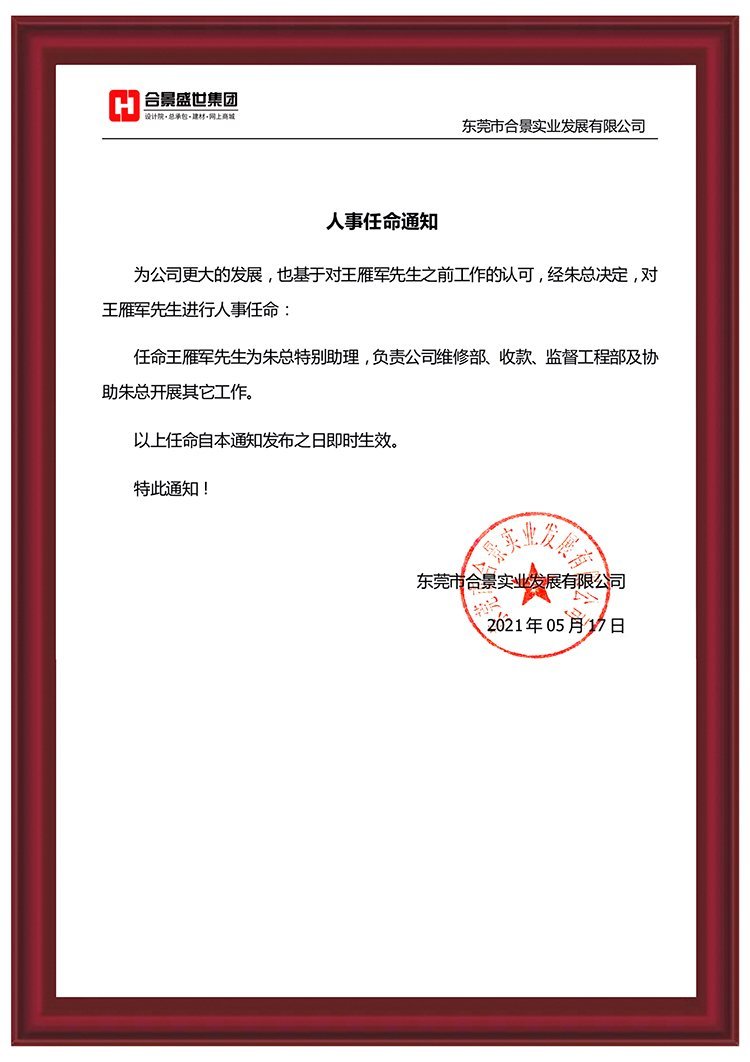 為推動公司更大發(fā)展,經(jīng)公司綜合評估,王雁軍先生將擔(dān)任朱總特別助理,負(fù)責(zé)公司維修部、收款、監(jiān)理部及協(xié)助總經(jīng)理開展其他工作。