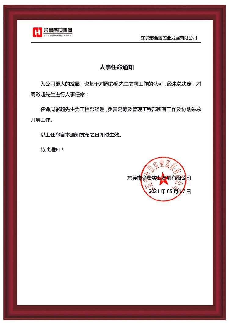 任命周彩超先生為工程部經(jīng)理,負(fù)責(zé)統(tǒng)籌及管理工程部所有工作及協(xié)助總經(jīng)理開展其他工作。